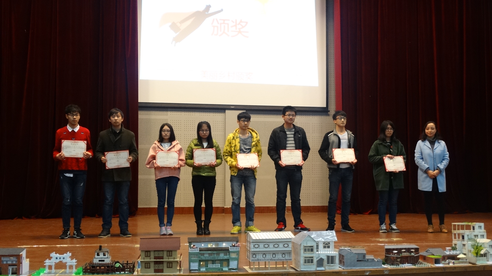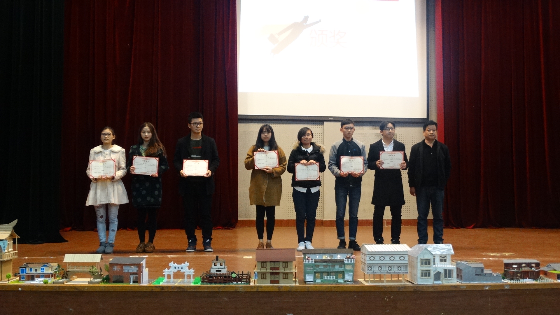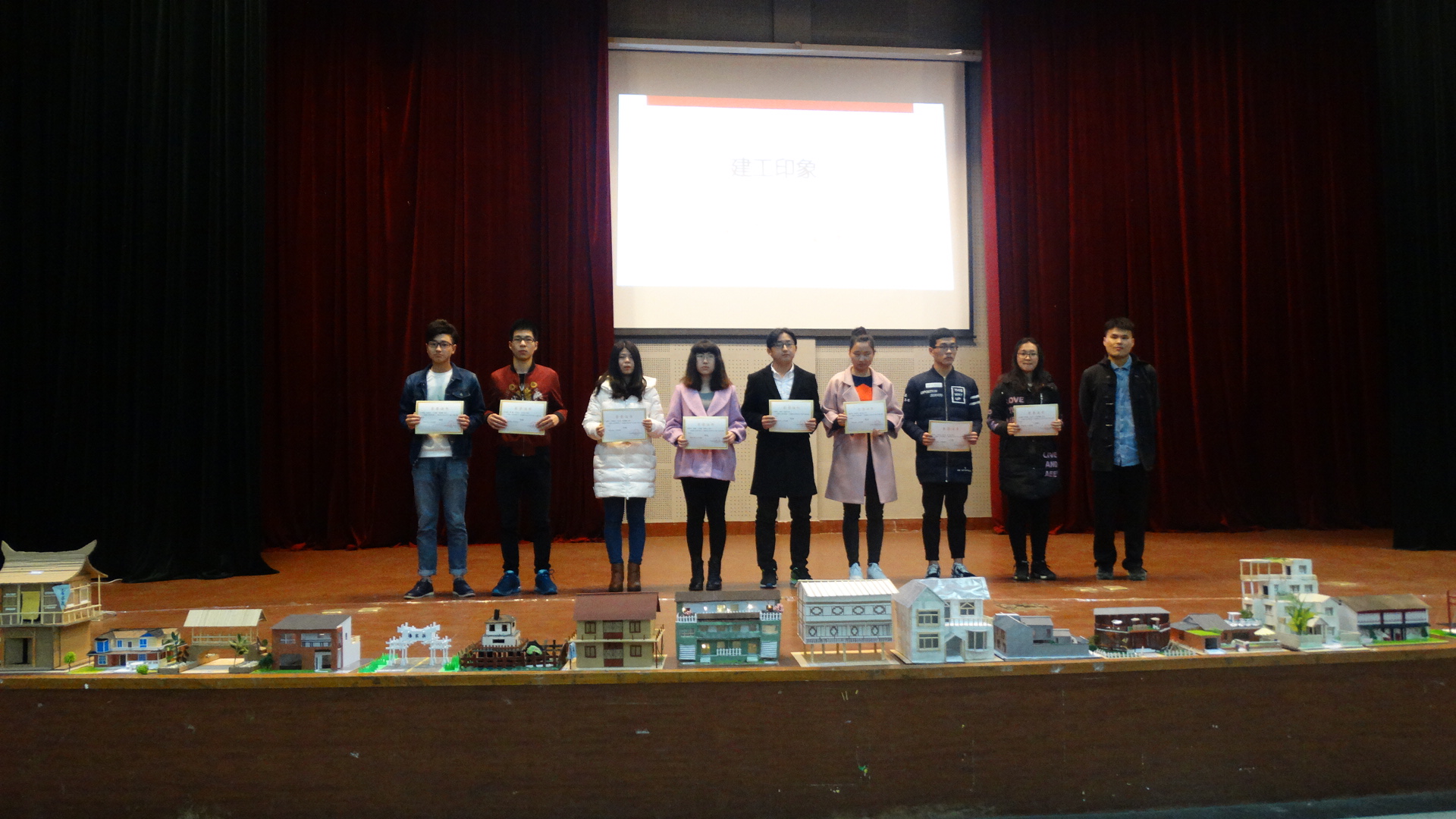 最后是美丽乡村颁奖环节,由顾晴女士和王卓琦女士为这些获奖队伍颁奖。舞台上展示了许多房屋建设模型,是建工学子用努力、用汗水、用智慧换来的成果,是对专业的理解,是智慧的结晶。颁奖过后,是受邀获奖同学进行作品介绍,黄金萍同学介绍了她们的小组成员及分工、作品的各方面细节、作评的具体制作过程。并详细地介绍了制作过程中的具体思路与困难,并点明了作品中的不足之处。