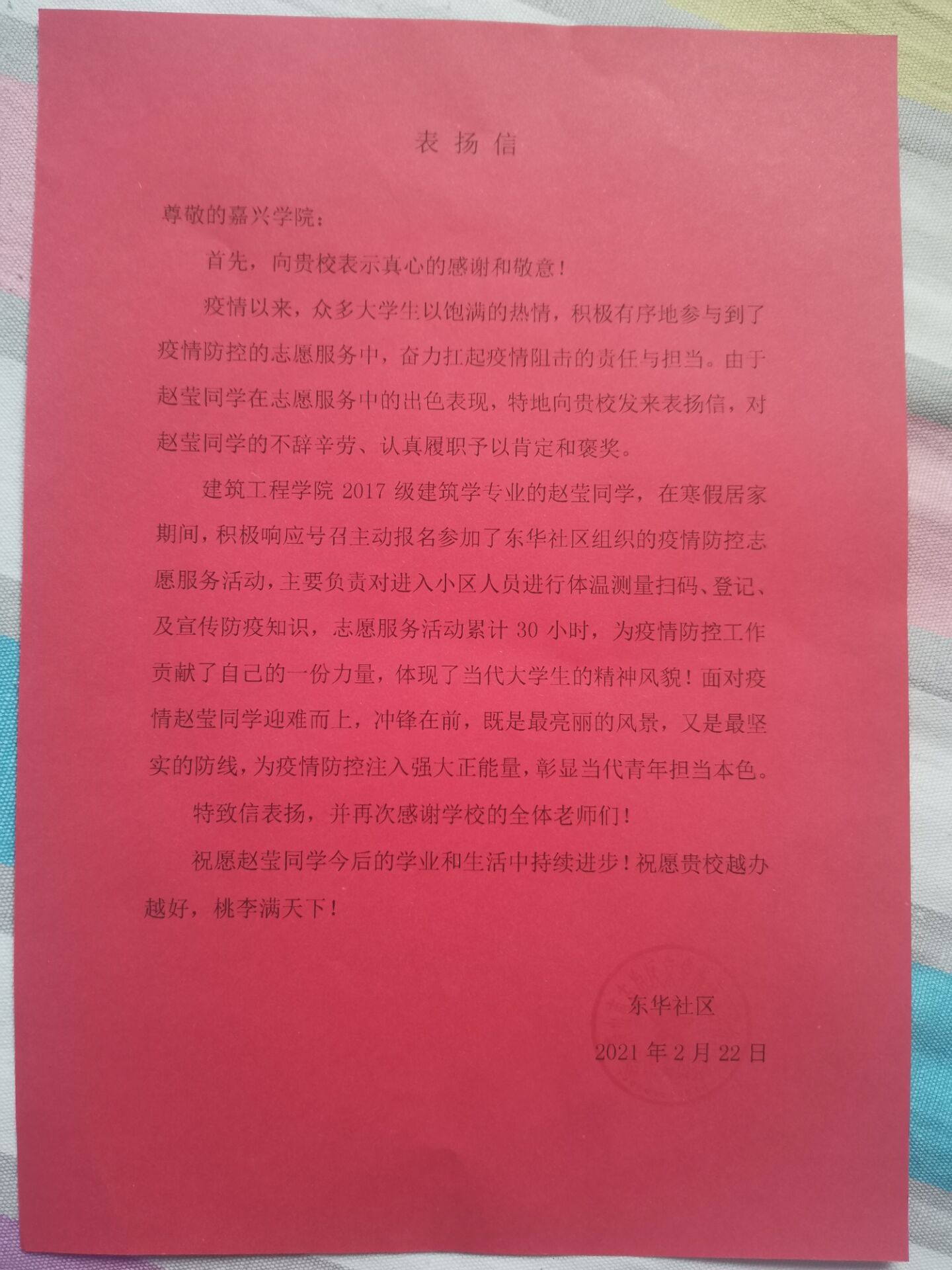 建筑172赵莹同学、工管181许涵茜同学、建筑192张峰源及高磊同学、建环201汪济磊同学、建筑202任学渊同学积极主动加入疫情防控志愿服务队伍、为当地疫情防控工作无私奉献提出了感谢和表扬,并对H图书馆