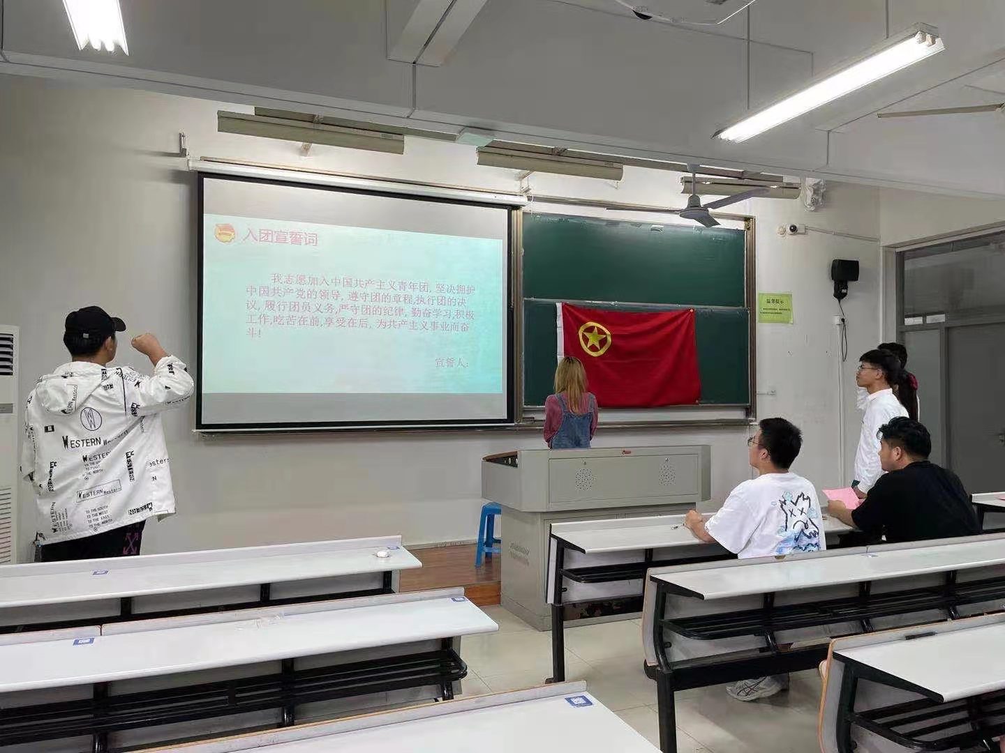 入团宣誓仪式在雄壮的国歌声中拉开帷幕。首先,主持人胡颖超同学介绍了本次发展新团员的相关情况,并宣读了新团员名单。3名新团员全体起立,老团员范凌晨同学为新团员颁发团员证并佩戴团徽,3名新团员在老团员的带领下面向鲜艳的团旗进行了庄严的宣誓。紧接着入团介绍人代表卢昱礽同学宣读了《团章》中有关团员的义务和权利的条款。三名新团员依次上台发言,讲述了自己对共青团的认识和感受,并提出了对未来团员历程的展望,对自身提出了需要改善的方面。瞿怀杰同学代表老团员做了发言,讲述了自己加入共青团的体会和成长经历,并对新团员的发展提出了一些期望。随后,分团委组织委员刘秉鑫为全体新团员致辞,祝贺各位新团员加入共青团,并希望他们能弘扬中华民族的优良传统,刻苦学习,树立远大理想,发挥团员先锋模范作用,无愧于胸前的团徽。