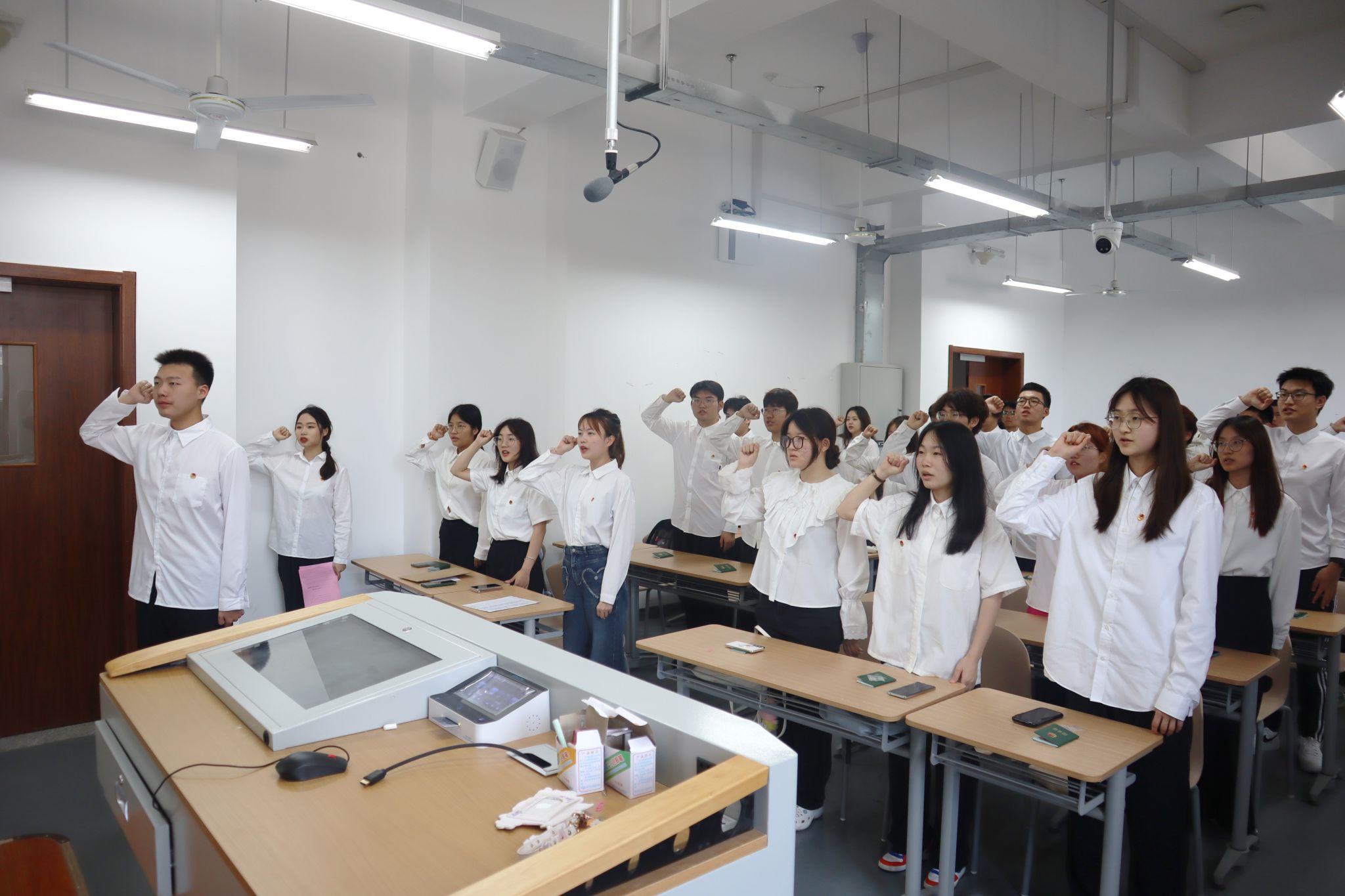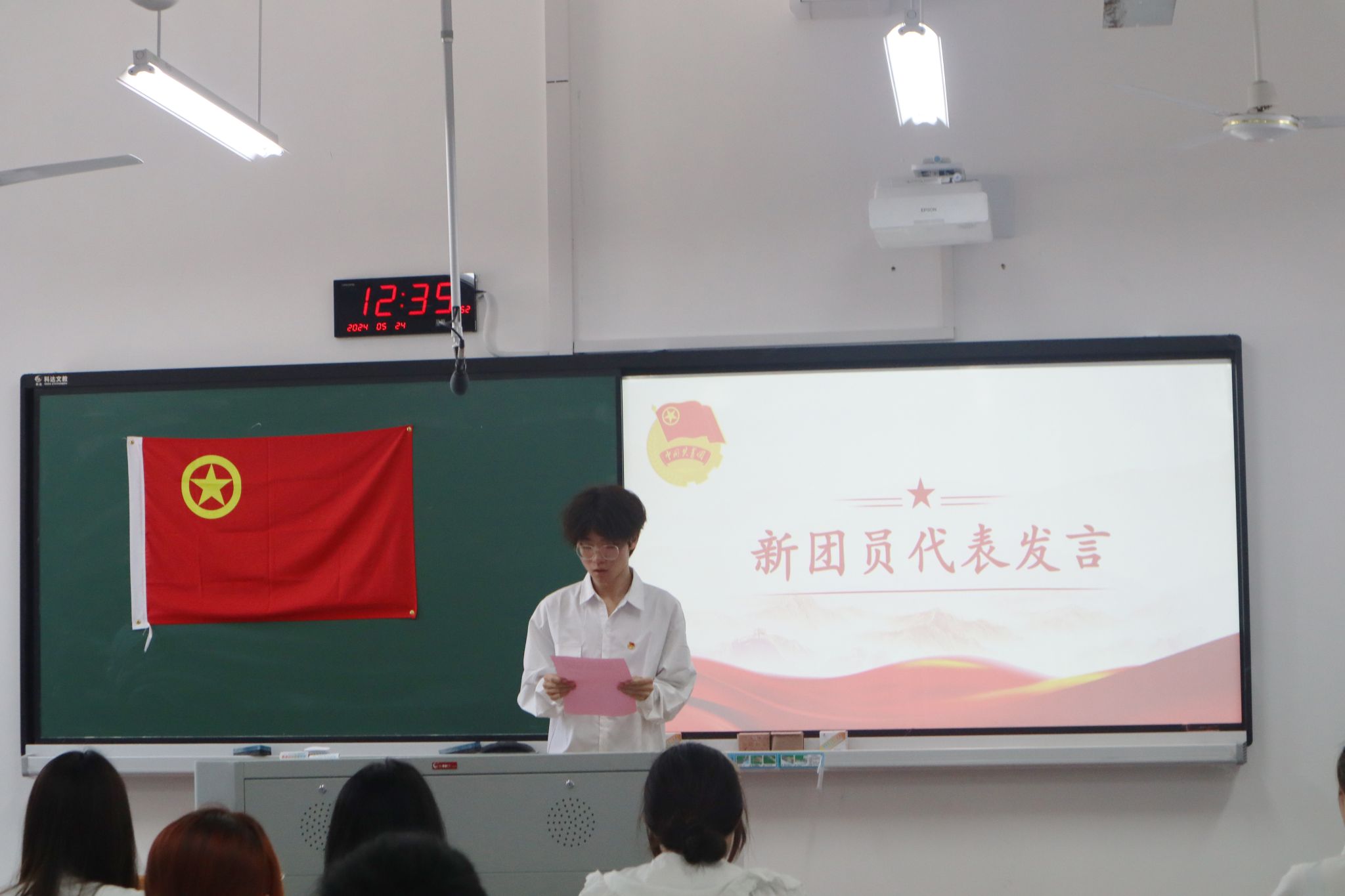 新团员们整齐地站在团旗前,庄严宣誓。他们的声音铿锵有力,响彻整个教室,展现了新一代团员的坚定信念和决心。