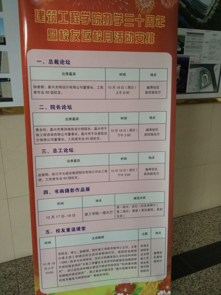 也迎来了办学三十周年。建工学院为此制作了办学三十周年的宣传栏和摄影书画展览,举办“总裁论坛”、“院长论坛”、“总工论坛”三个校友论坛和“老教师课堂”等活动。
