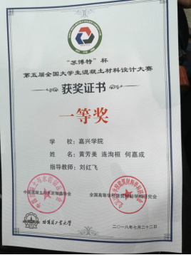 黄芳美、连洵桓、何嘉成三名学生组成的嘉兴学院队以优异成绩获得团体一等奖,是获得一等奖以上奖中唯一以“学院”冠名的高校。刘红飞老师荣获”优秀指导老师奖”,在颁奖会上,嘉兴学院队还成为裁判组特别表彰的八个队伍之一。