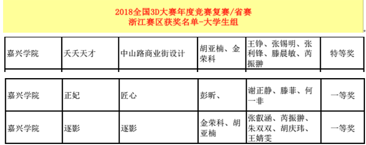 在2018年全国3D大赛浙江赛区决赛中获奖颇丰,一共收获17组奖项。其中浙江赛区特等奖1项,浙江赛区一等奖2项,浙江赛区二等奖7项,浙江赛区三等奖4项。