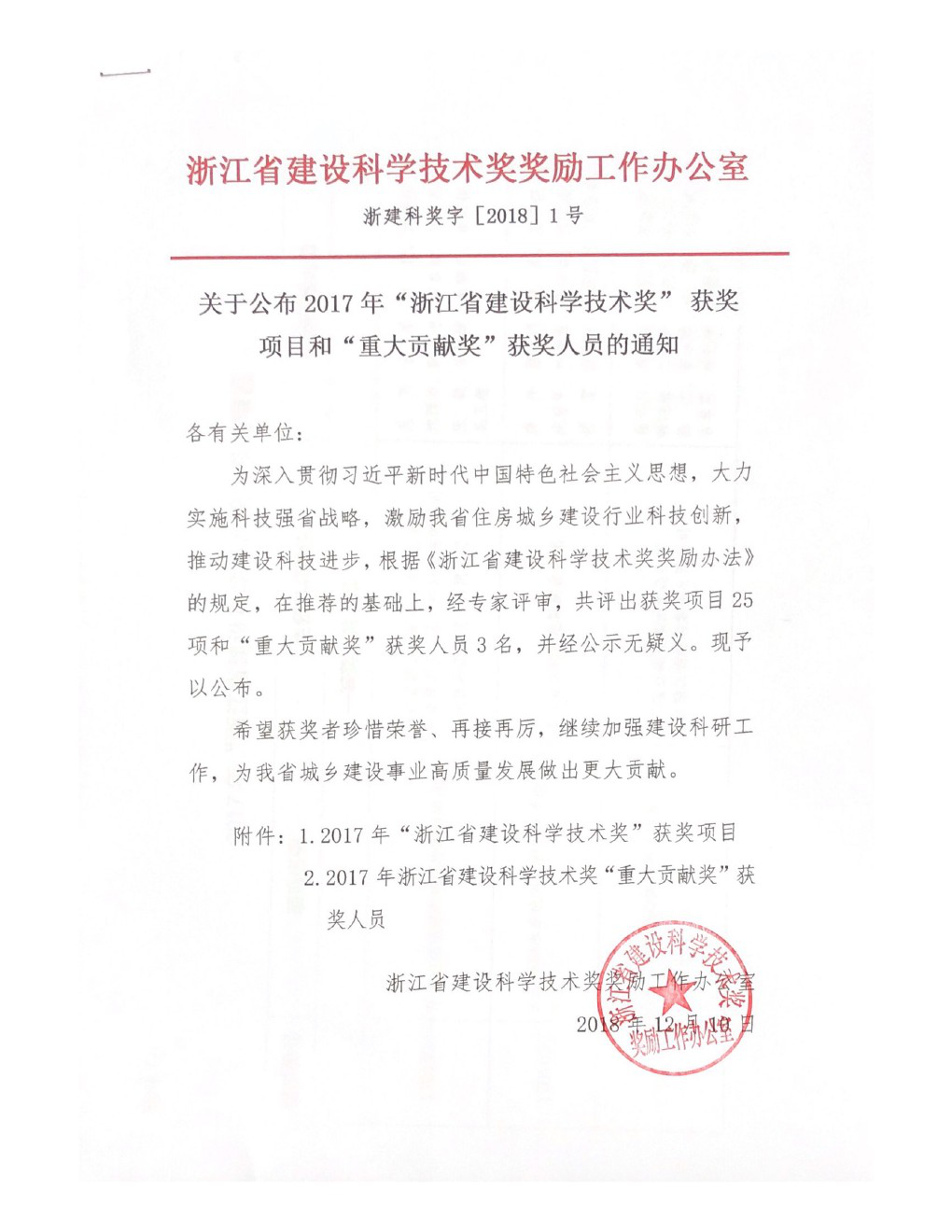 2017年度“浙江省建设科学技术奖”于2018年12月14日正式发布,共评出一等奖3个,二等奖11个,三等奖11个。中元建设集团股份有限公司和嘉兴学院共同完成的《零水泥耐腐蚀FKJ混凝土施工技术》项目获得二等奖。嘉兴学院H图书馆