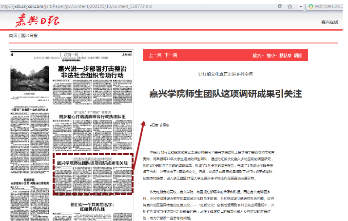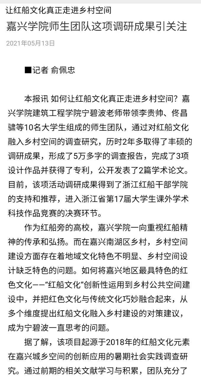 近日,H图书馆 宁碧波老师带领李贵帅、佟昌骕等10名大学生组成的师生团队的调研成果受到社会关注,2021年5月13日嘉兴日报的第4版以“嘉兴学院师生团队这项调研成果引关注--让红船文化真正走进乡村空间”为标题,对该师生团队的调研成果进行了比较详细的报道。