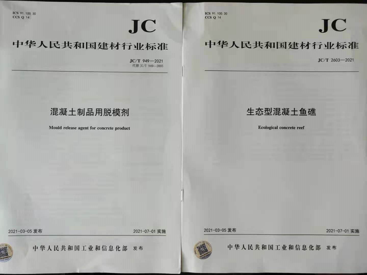 日前,《混凝土制品用脱模剂》JC/T 949-2021;《生态型混凝土鱼礁》JC/T 2603-2021二项行业标准由中国建材工业出版社出版发行。根据中华人民共和国工业和信息化部公告(2021年第6号),由嘉兴学院牵头起草的这二项行业标准,2021年3月5日正式发布(网站公告时间2021年4月19日),实施时间2021年7月1日。