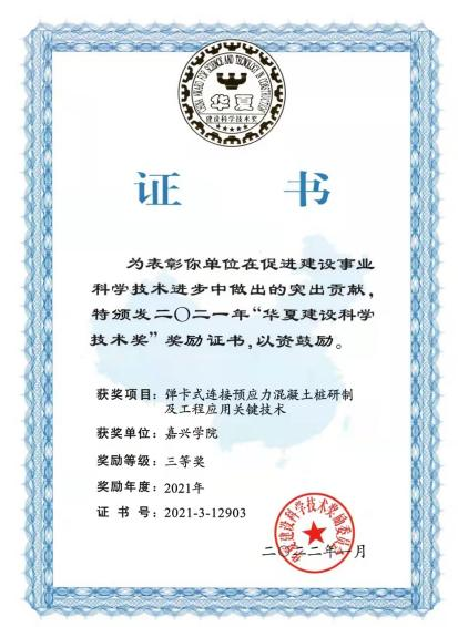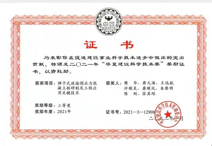 蒋元海教授参与完成的“弹卡式连接预应力混凝土桩研制及工程应用关键技术”科技成果荣获“2021年度华夏建设科学技术奖”三等奖,嘉兴学院为成果的第三完成单位,蒋元海教授为成果的第二完成人。