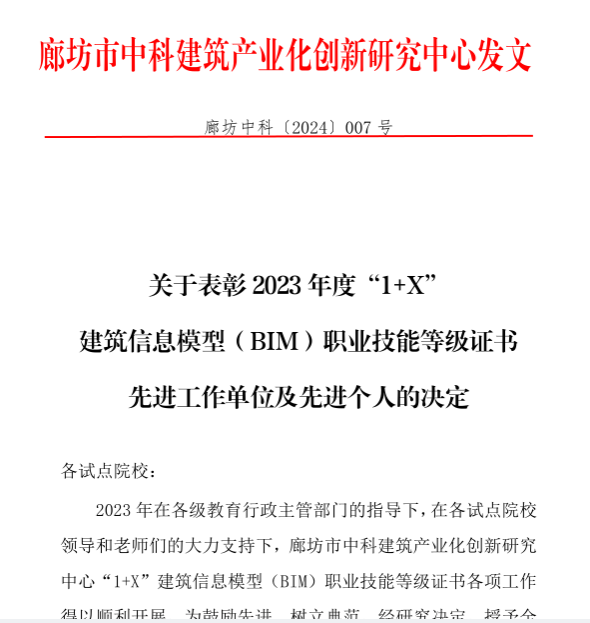的“1+X(BIM)职业技能等级证书考核站点”荣获教育部2023年度"1+X"建筑信息模型(BIM)职业技能等级证书先进工作单位。廊坊市中科建筑产业化创新研究中心为教育部指定的“1+X”建筑信息模型(BIM)培训评价组织,近日发文授予H图书馆