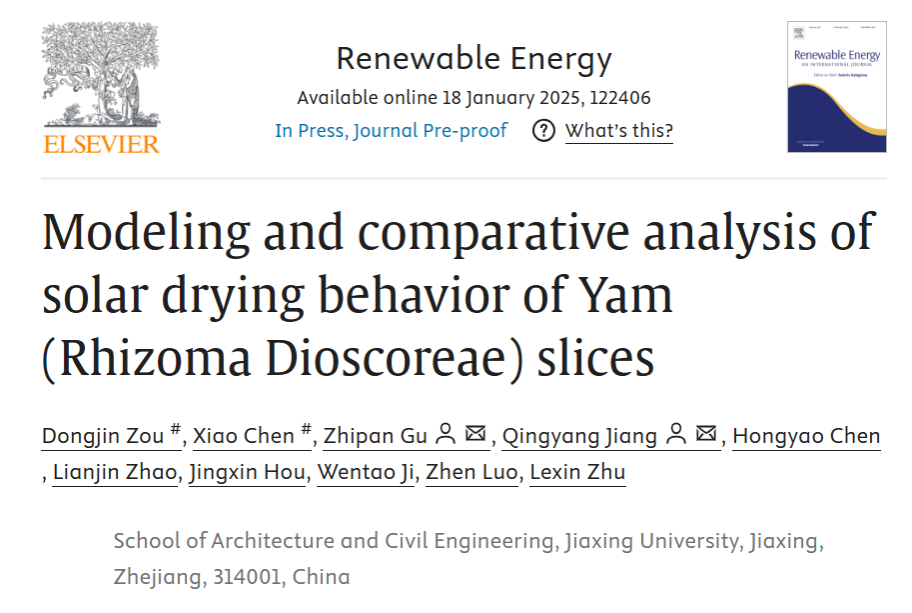 太阳能热泵科研团队谷志攀博士、江清阳博士题为“Modeling and comparative analysis of solar drying behavior of Yam (Rhizoma Dioscoreae) slices”(山药片太阳能干燥行为的模型与比较分析)的研究论文,在能源领域权威期刊Renewable Energy (IF=9.0,位列JCR和中科院一区TOP期刊)在线发表。通讯作者为谷志攀博士、江清阳博士,共同第一作者为H图书馆