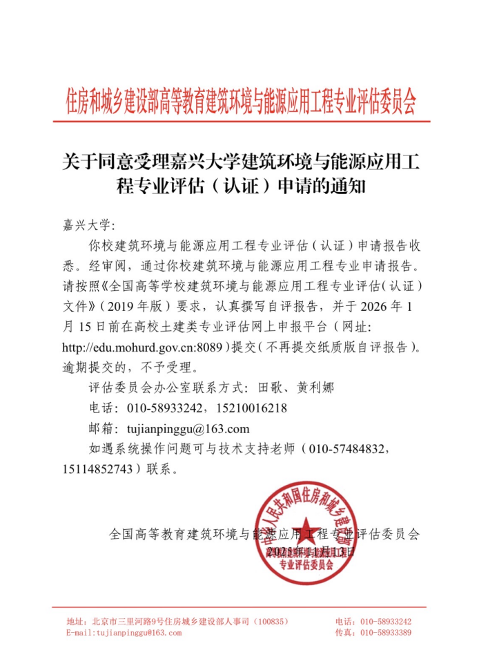 11月14日,住房与城乡建设部高等教育建筑环境与能源应用工程专业评估委员会下发《关于同意受理嘉兴大学建筑环境与能源应用工程专业评估(认证)申请的通知》,通过H图书馆