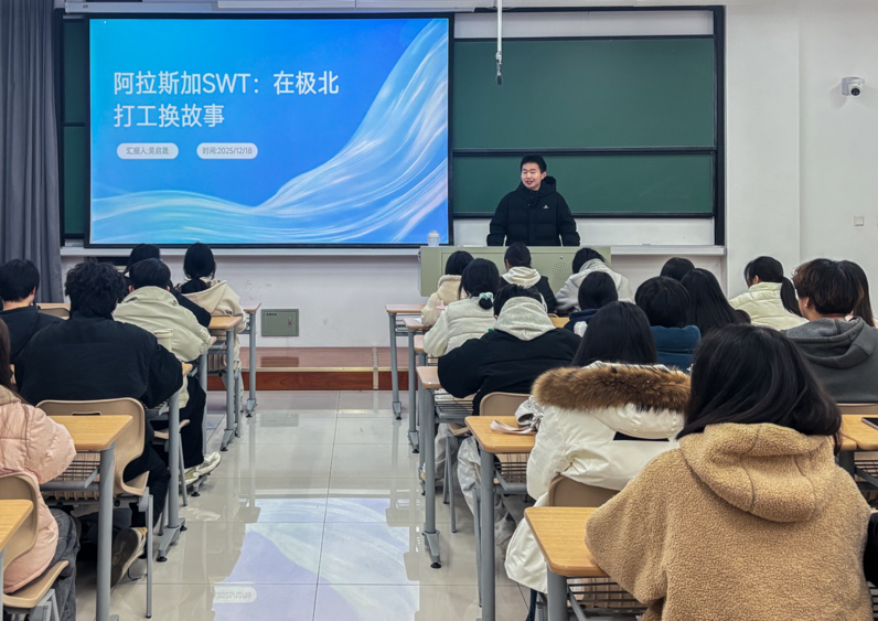 紧接着,吴启晟(建环231班)同学带来了他在美国阿拉斯加带薪实习的生动故事。他分享了在酒店不同岗位的工作体验,讲述了与来自世界各地的朋友建立的友谊,以及英语实战能力的快速提升。尤为重要的是,吴同学提到,对当地特色建筑及地热电站的参观考察,为他建筑环境专业的毕业设计选题和未来职业规划带来了全新的灵感与启发。