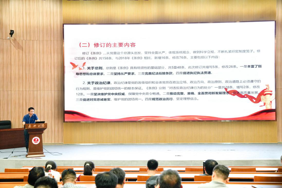 在行政楼一楼报告厅开展“推进党纪学习教育走实走深”专题党课,学院党委书记童勇军担任主讲人,学院100余名师生党员参加会议。