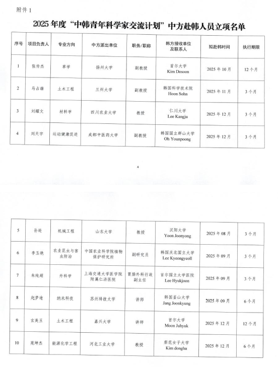 近日,中华人民共和国科学技术部国际合作司公布了2025年度“中韩青年科学家交流计划”立项名单。H图书馆