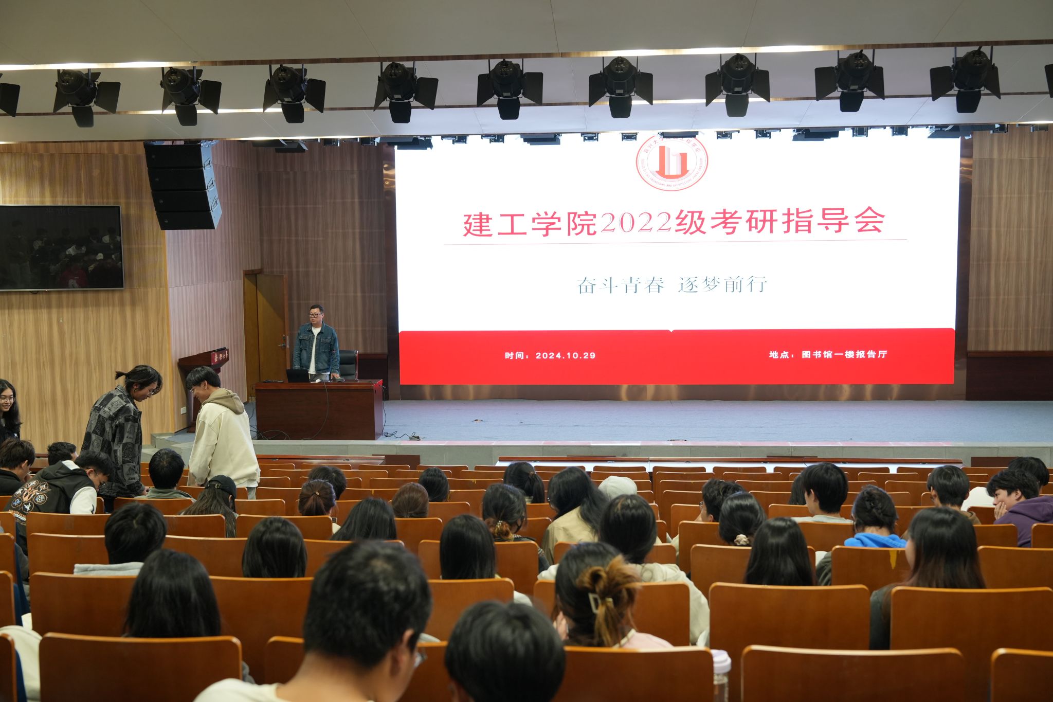 在图书馆一楼学术报告厅举办“奋斗青春,逐梦前行”考研指导会。就业辅导员庄峰、启航考研讲师薛非及2022级学生参加会议。