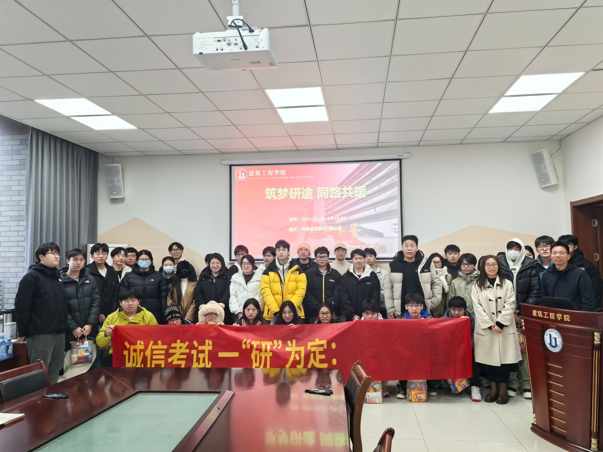 在兴德楼北楼512会议室为2025届考研学子举办“筑梦研途,同路共暖”考研慰问活动。学院党委书记童勇军、党委副书记杨智慧、党委委员武小鹏、辅导员庄峰参与本次活动。