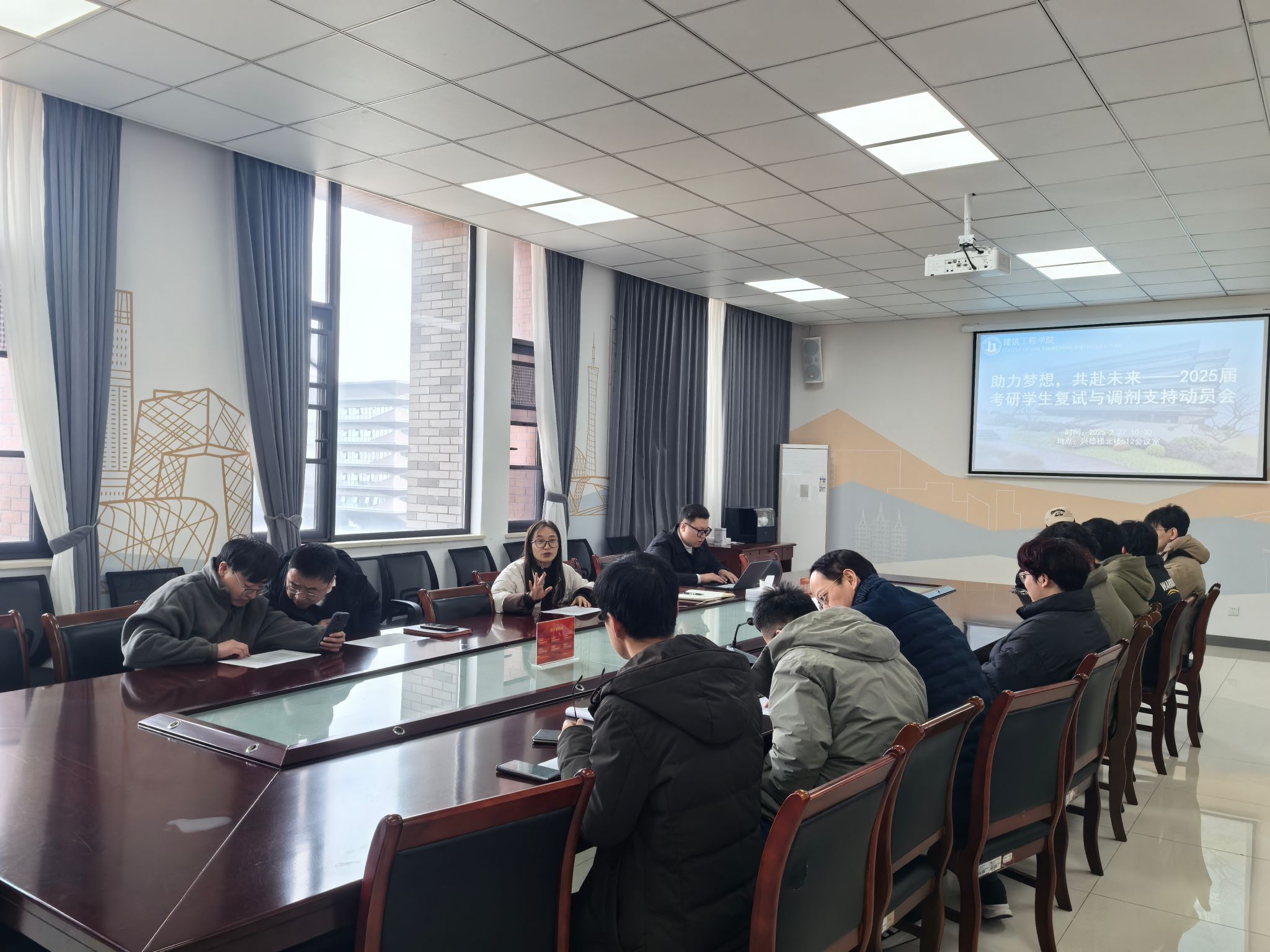 在兴德楼北楼512会议室举办“助力梦想,共赴未来——2025届考研学生座谈会”。学院党委副书记杨智慧、副院长熊厚仁、就业辅导员庄峰、毕业班班主任及考研学生线上线下同步参会。