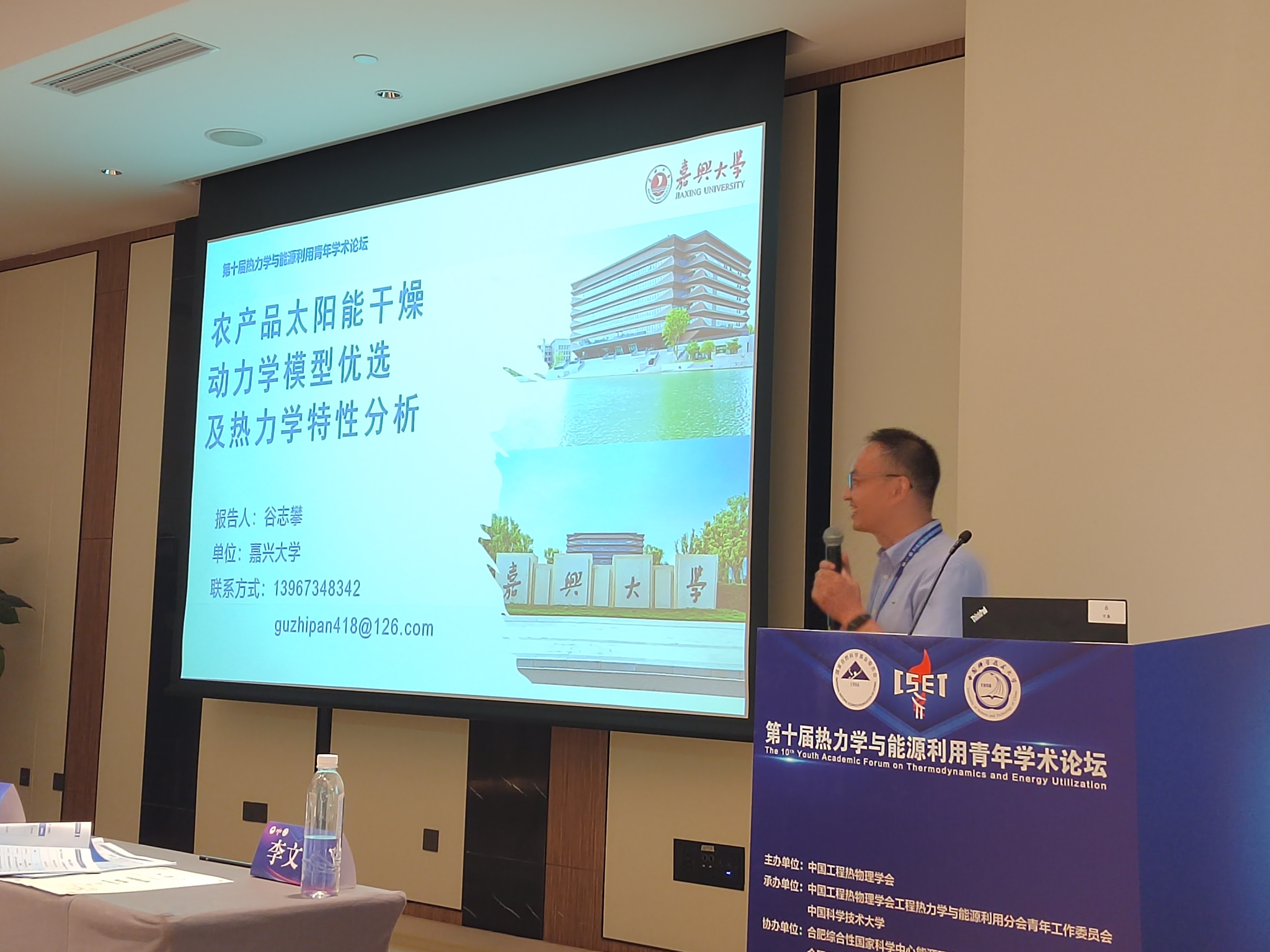 会议期间,谷志攀老师与侯景鑫老师认真聆听了大会报告,并就热力学与能源利用方面的研究热点,与国内众多青年学者进行交流探讨。谷志攀老师受邀在基础热力学分会场作题为《农产品太阳能干燥动力学模型优选及热力学特性分析》的学术报告。针对鲜贮农产品易腐损问题,研究团队构建了太阳能干燥装置,以山药为对象系统开展薄层干燥动力学分析。通过优选薄层干燥模型,采用拉普拉斯变换方法计算有效水分扩散系数,并基于Eyring-Polanyi方程解析活化能、焓变、熵变、吉布斯自由能变等热力学参数。该研究为农产品太阳能干燥提供了理论完善、方法创新的技术支撑,得到了分会场点评专家的好评,并引发了参会代表对本研究课题的兴趣与关注。谷志攀老师同时在分会场介绍了H图书馆
